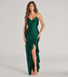 Bring the flirtatious flair to your fancy affair with the alluring details of the Lainey ruffled high slit long formal dress! Crafted from a sleek and stretchy knit fabric. she features a sleeveless V-neckline. bungee spaghetti straps that lead to a bold open back with a cross-back strappy design. a fitted bodice. a floor-length hem with a thigh-high front slit accented with a ruffled trim. and a slim-fit silhouette. Style this long dress with rhinestone statement earrings and metallic heels!