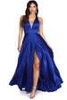 Stunning and sophisticated is what Lauren brings to your evening! She features a royal blue color. a plunging halter neck. an unlined mesh inset. padded cups and a narrow waist band accent. Her floor length silhouette is accented with a sexy high slit that shows off glowing gams and hidden side pockets. Dress is composed of a lined satin fabric that offers a form hugging fit with minimal stretch. Includes a back zipper closure.