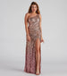 Bring the sparkle with a formal dress that makes your moment a special one! The dress features a one-shoulder dress neckline. a double-row bungee spaghetti strap. and padded cups. The slim-fit bodice leads to an A-line silhouette with a high side slit. The dress features sequins that have a dazzling ombre effect that shimmers under the spotlight. The dress is composed of a lined mesh fabric that offers a form-hugging fit with minimal stretch. Complete look with rhinestone heels.