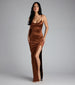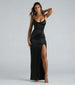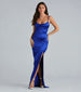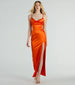Fits like a dream and turns heads. the Laverne formal satin column dress will have you looking oh-so-gorgeous at your black-tie events! It features a V-neckline with a cowl overlay. spaghetti straps. a lace-up back design. and a flattering column silhouette with a high front slit.