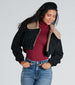 Layer on all the cozy vibes with this adorable faux sherpa denim jacket perf for the season! It features a faux sherpa contrast wide collar. long sleeves with elastic cinched hems. a button-down front. buttoned chest pockets. and a cropped elastic cinched hem. The cotton-blend denim features a cozy faux sherpa lining. Style this trendy jacket over a sweater dress with knee-high boots for a chic 'fit.