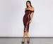 Bring the shine to match your glam taste in our sparkling Layla dress! She features an off the shoulder neckline. short sleeves. a natural fit waist and a curve hugging midi length silhouette with bold side slit. Dress is composed of a lined mesh fabric adorned with sequins throughout. Garment offers a minimal stretch and includes a back zipper closure.