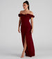Showcase elegance and glamour in the Leslie crepe mermaid dress. She features an off-the-shoulder neckline with a chic detailed overlay. short puff sleeves. a high waist seam with side pleated detailing. and a faux wrap floor-length skirt with a front slit and a mermaid silhouette. Style this dress with rhinestone earrings and new heels.