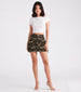 Level up your cute and casual everyday look with this of-the-moment cargo mini skirt. It features a high-rise waist with belt loops. a front button closure. back pocket flaps. cargo-style side pockets with adjustable straps and buckles. a mini-length hem. and a form-hugging fit. Style with a corset top and clear mules.