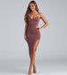 Shine like the life of the party in this mini dress that brings sparkle to your celebrations! The dress features a sleeveless V-neckline. bungee spaghetti straps. an asymmetrical high side slit for a sultry show of leg. and a midi-length silhouette. The dress is composed of a lined glitter knit fabric that offers a form hugging fit with a moderate stretch. Complete look with ankle booties and a moto jacket.
