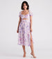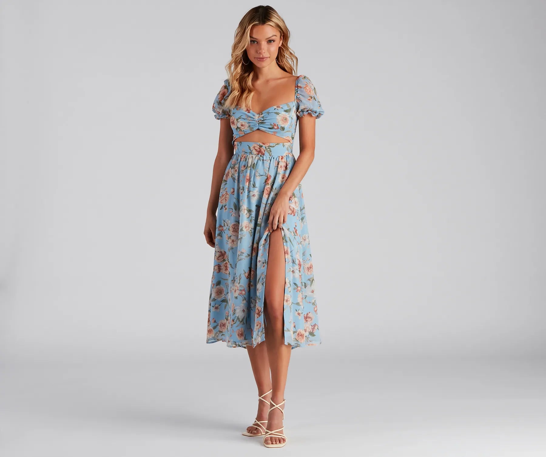 This floral cutout midi dress makes getting ready a breeze! It features short puff sleeves and a ruched sweetheart bodice with a flirty waist cutout that leads to a flowy. midi-length silhouette with a slit accent. Composed of a chiffon-lined fabric with no stretch. Style with a trendy mini tote.