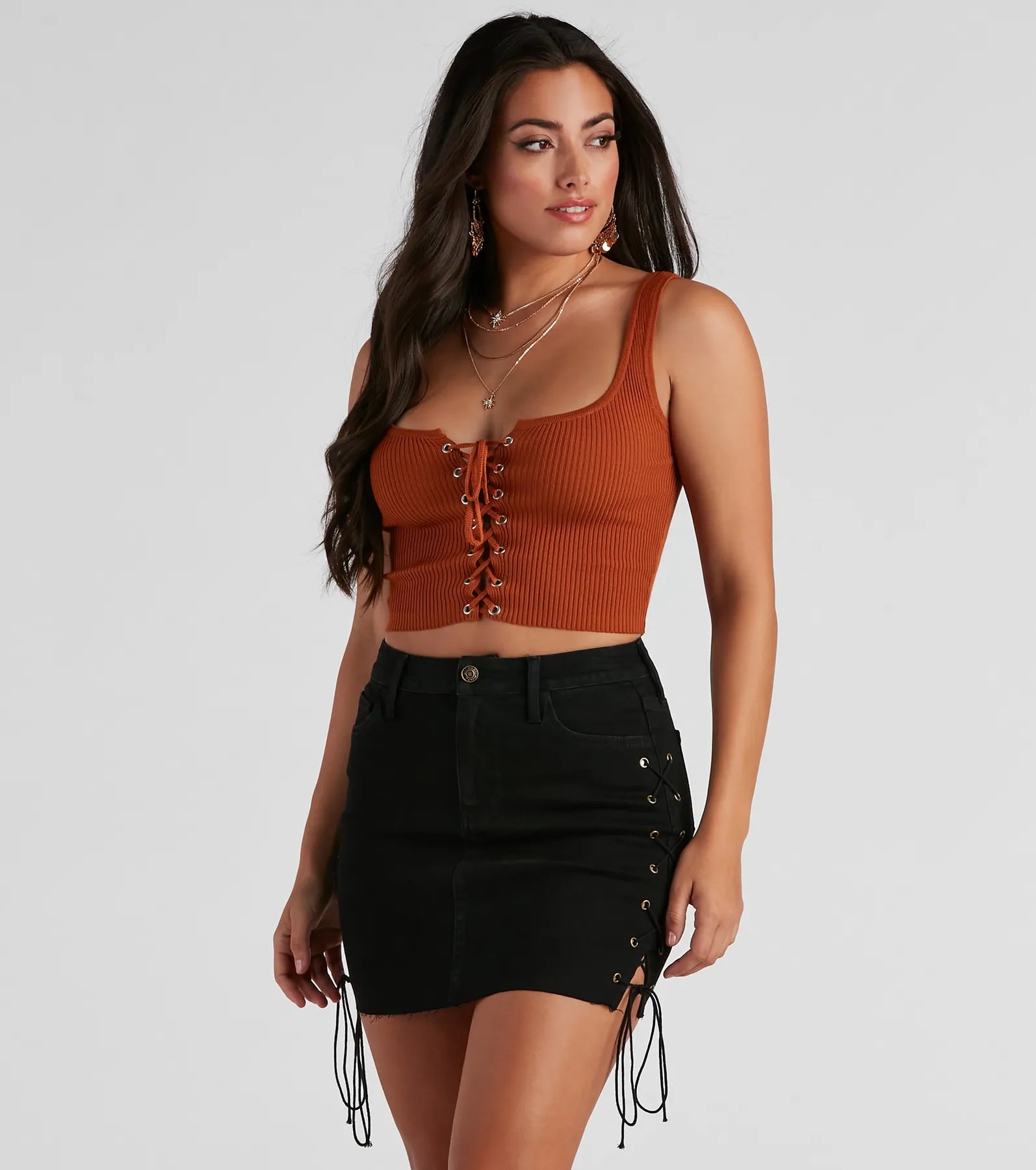 Looking for a light layer? This sweater knit tank top is a cute choice! It features a sleeveless. scoop neck. tank-style straps. a front lace-up placket. cropped hem. and stretchy rib-knit fabric. Complete the look in a denim skirt for a coffee run.
