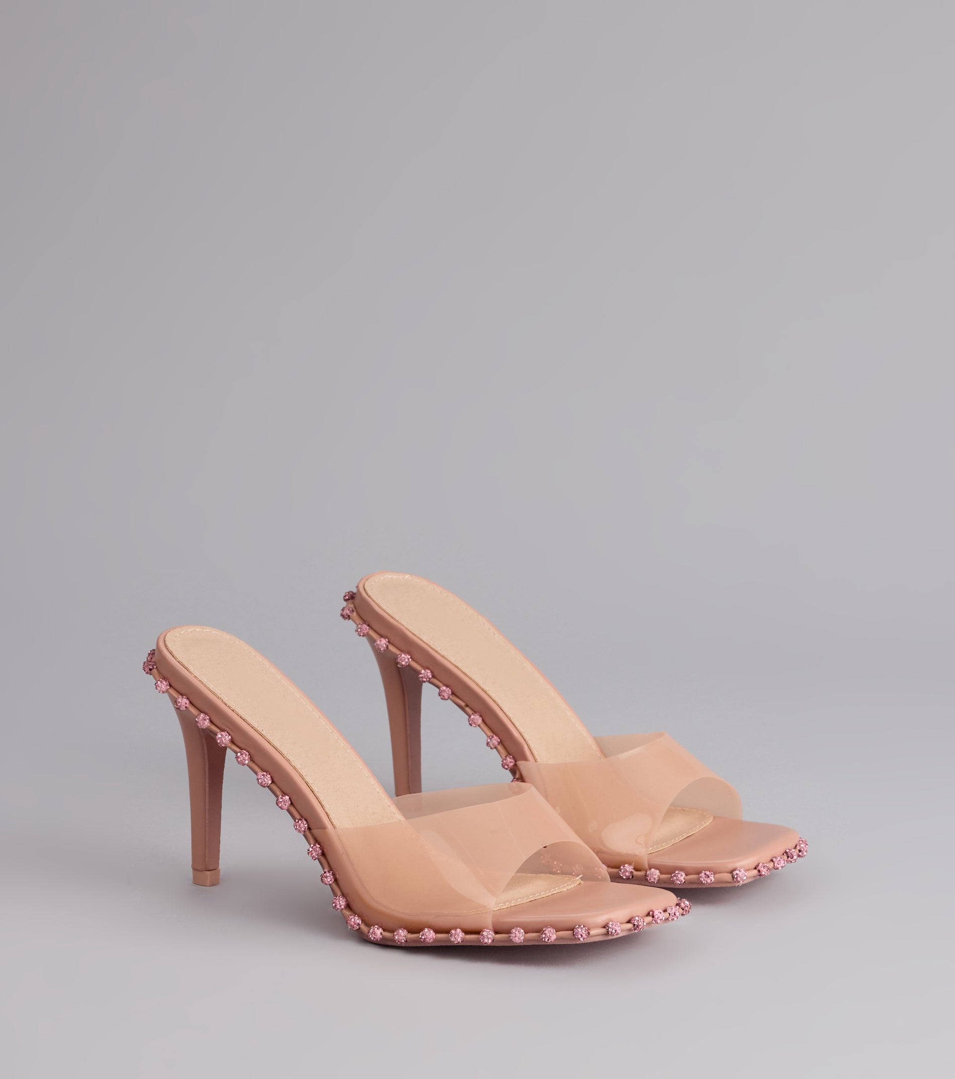 These heels don't just walk. they shine. Featuring a square toe. colored PVC strap. and rhinestone embellished ball trim. these stilettos are all about glam with a twist.