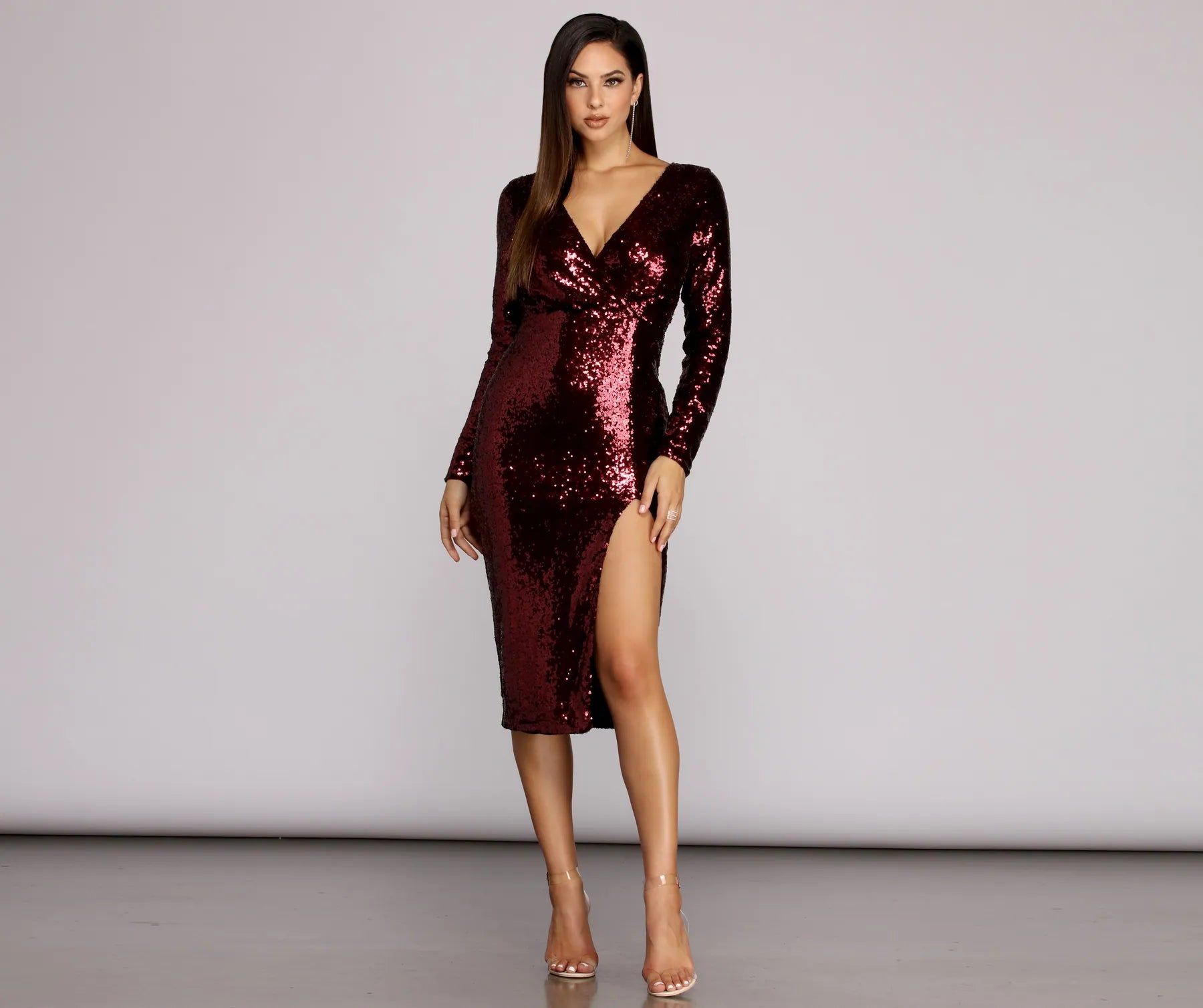 Lend your sparkle a distinctly sophisticated aura in our lovely Linley dress! She features all-over sequin embellishment. a surplice bodice with deep V neckline and back zip. long sleeves. and a curve-hugging midi-length pencil skirt with side slit at front. Linley is fully lined and made from a woven material with little to no stretch.Â