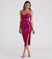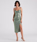 Glimmering and shimmering metallic creates the perfect shine on the Liv formal midi dress to stun at birthdays. themed parties. and school dances! She features a sleeveless cowl neckline with spaghetti straps. a form-hugging silhouette. and a side pleated seam that leads to her asymmetrical wrap hem with a slit. The formal dress is composed of a sparkling metallic knit fabric with moderate stretch. Style with rhinestone strap heels to complete the look!