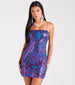 Hey babe. live it up and light up the dance floor in this stunning sequin mini dress! It features a sleeveless square neckline. bungee spaghetti straps. and a short. form-hugging silhouette. The sheer mesh fabric includes a full knit lining and has a chic all-over sequin scroll embroidered design. Complete the look with platform heels.