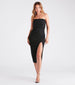 Show off a gorgeous radiance at cocktail hour in the Livia glitter knit formal midi dress! She features a strapless neckline with flexible boning inserts at the bodice creating an angled design. a pleated cowl overlay. a high waist seam. a midi-length hem with a thigh-high side slit to showcase some leg. and a slim-fit silhouette to flaunt your figure. The textured glitter knit fabric offers a moderate stretch. Style with strappy stilettos.