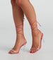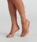 Keep on living that fab life in these glam clear heels! They feature an open square-shaped toe with a clear strap. thin faux leather straps that wrap around the leg. and a thin clear lucite heel. Style these shoes with a corset top and boyfriend jeans.