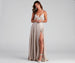 Sparkly and sultry. the Lizzie glitter formal dress is designed to captivate every guest at prom! She stuns in a classy. sleeveless. V-neckline. princess seams on the bodice. adjustable spaghetti straps so you can customize her fit. and side pockets perfect for keeping your hands warm. Make heads turn everywhere you go thanks to the caged-back detail that radiates a femme allure atop the A-line silhouette that effortlessly kisses the floor and features a sexy high-cut front slit. Complete your prom look in elegant earrings and a dainty bracelet.