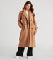Lock down a chic look with a trench coat that brings the drama to your look! The trench features a collared neckline. long sleeves with an adjustable buckle cuff. a double-breast button closure. a tie waist belt with loops. hidden side pockets. and a below-the-knee length. The coat is composed of faux sherpa knit fabric that offers a relaxed fit with minimal stretch. Complete the look with a bodysuit. dark-wash denim. and booties.