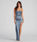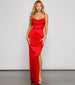 Make a stunning entrance at your next formal affair in the Lola high slit satin dress. This luxurious floor-length dress features a sleeveless cowl neckline. a floor-sweeping silhouette with a sultry high side slit to elongate your legs. and a form-hugging fit. Perfect for weddings. black-tie events. or school dances.