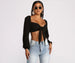 Tie up your style with a fab crop top. Head out to that next festival in a chic crop top that features a plunging tie front bodice with a sweetheart bust. a cropped hem. and flowy long sleeves with elastic cuff. The top is composed of a lightweight gauze knit fabric that offers a relaxed fit with minimal stretch. Complete look with skinny high waist jeans and sunglasses.