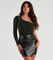 Look your best for a night out in this glam rhinestone crop top featuring an eye-catching long sleeve. and a one-shoulder neckline on sheer mesh knit fabric. Complete the look in wide-leg pants and heels.