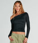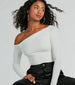 You'll be looking simply flawless in this smooth knit off-the-shoulder top. It features an asymmetric off-the-shoulder neckline with pleated detailing. long fitted sleeves. ruching down the side seams. a mid-length hem. and a form-hugging fit. The double-lined smooth knit fabric offers a seamless look with plenty of stretch. Style with cargo pants and mules!