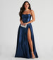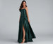 • Floor-length hem. A-line silhouette. high front slit
