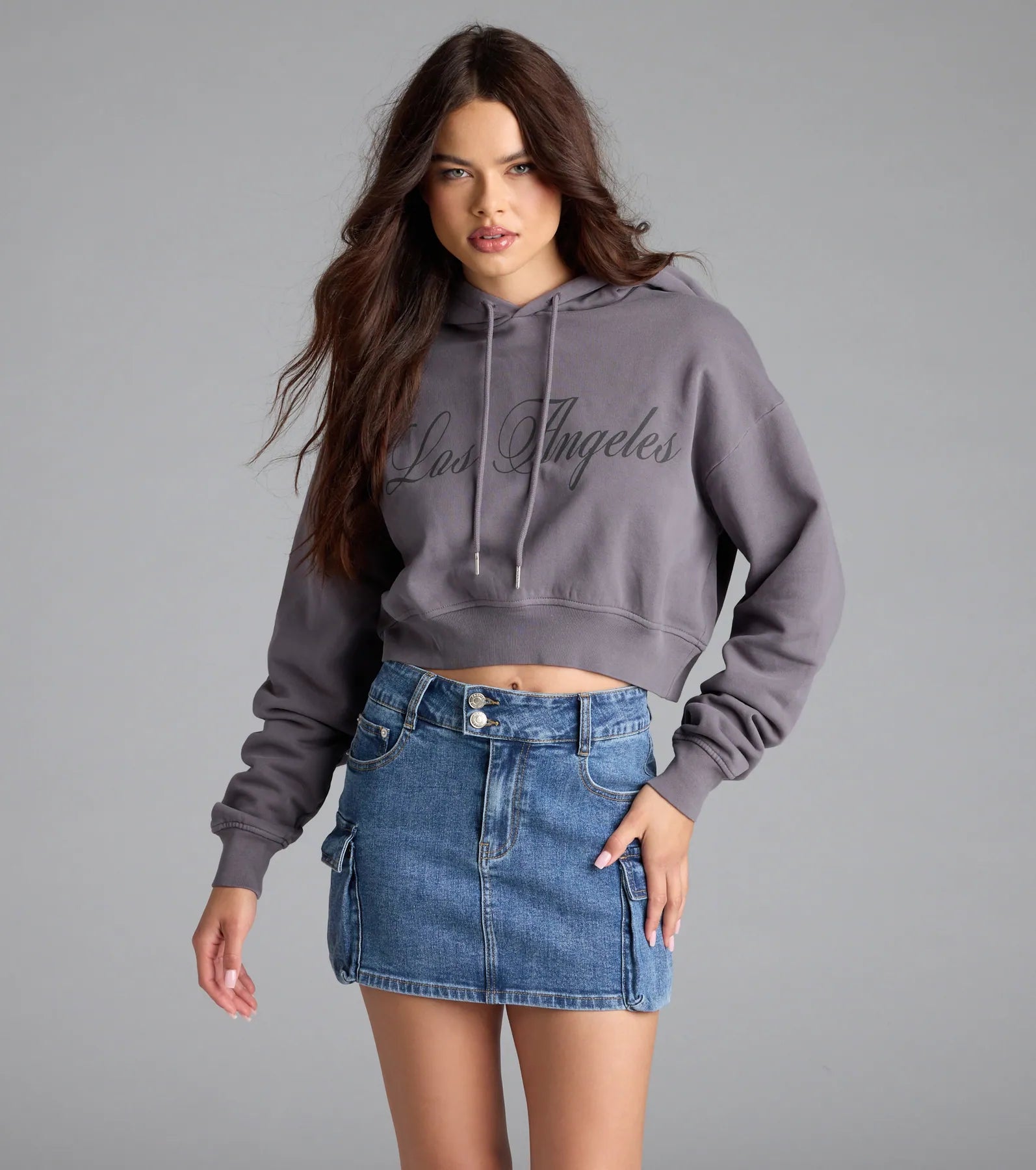 Keep it chill in this oversized crop hoodie for off-duty days! Made with a soft fleece lining to help keep you cozy and a front graphic script "Los Angeles" that represents the iconic city.