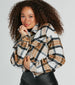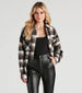 Showcase your love for this cozy season with this on-trend cropped shacket. It features a collared neckline. long sleeves. a multi-button down front. and a cropped. cinched back hem. The flannel woven fabric features an all-over plaid print. perfect for the fall time. Layer over a bodysuit with faux leather pants for an elevated look.