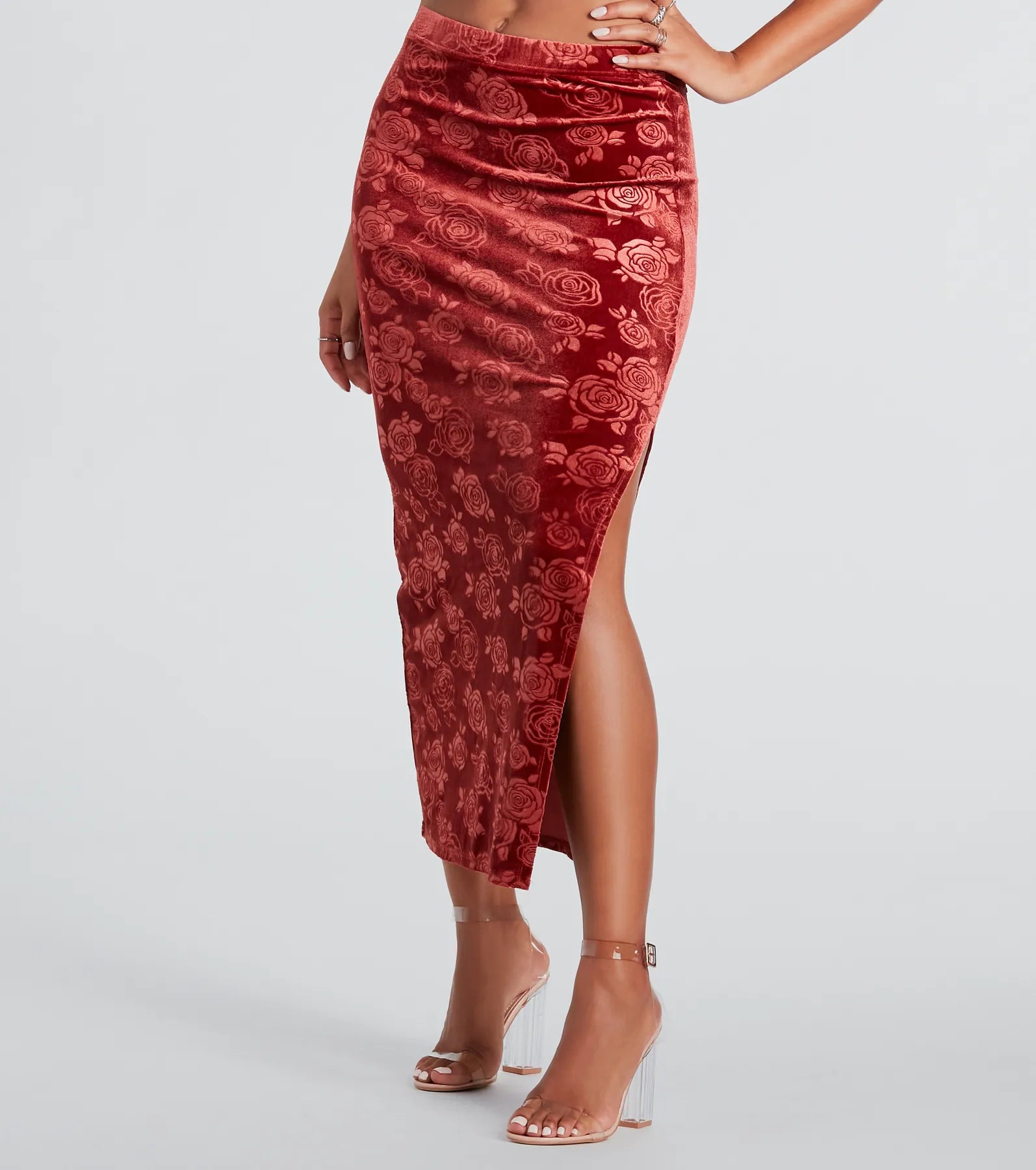 With this midi skirt. you won't be asking yourself if they love you not! It features a high-rise waist. bodycon silhouette. and a sultry velvet floral burnout pattern with a sewn-in knit lining. Complete the look with the matching top for a date!