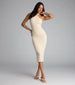 Quiet luxury. but she still turns heads! With a flattering halter neckline. cutout back. and a sneaky little slit. this midi keeps it classy with just the right amount of edge.
