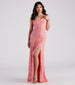 The Lynda formal dress is an absolute stunner showcasing sparkly sequins to bring the shimmer at the prom. military balls. and ceremonies! She features a sleeveless cowl neckline. adjustable spaghetti straps. and a flattering a-line silhouette with a skin-flaunting slit along her floor-length hem. The formal dress is composed of a mesh sequin-patterned fabric with a knit lining and minimal stretch. Style with fringe earrings and a clutch to complete the look!