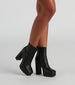 These sleek faux leather booties were made to bring the drama to your look! They feature a square-shaped toe. a tall platform and block heel. and an inner zipper closure. Style with glitzy rhinestone jewelry.