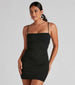 Make your mark as the best dressed in the club! This crepe mini dress will be the hit of the night featuring a sleek. sleeveless. square neck. spaghetti straps. an open caged back design. and a bodycon silhouette. Complete the look in glam earrings.