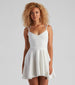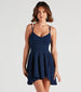 Showcase your flirty style in this adorable sleeveless skater dress. It features a V-neckline. dual spaghetti straps that lead to a cross-back strap design. a short skater skirt with a faux wrap front. and a fit and flare silhouette. Complete the look with cute block heels.
