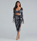 The obsession you'll have with this fabulous marble print midi dress is so real! It features a V-neckline with a twist-front design. an alluring front waist cutout to showcase some skin. long fitted sleeves. a ruched side seam that leads to a high-cut side slit. and a midi-length hem with a form-hugging silhouette. The stretchy knit fabric features a trendy marble print pattern. Style this midi dress with spiral heels!