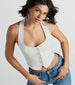 Show off a major slay in this sleek and edgy faux leather cropped vest! It features a sleeveless square neckline. halter straps. a partially open back. a button-down front. and a fitted. cropped hem. The smooth faux leather fabric gives off a chic sheen. Complete the look with the matching wide-leg pants and strappy stiletto heels.