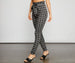 Create a major style moment with pants that slay! The pants feature a plaid pattern. an elastic paperbag waist. a tie-waist belt. and a skinny leg fit with a tapered hem. The pants are composed of a woven knit fabric that offers a form hugging fit with a moderate stretch. Complete look with a bodysuit and mules.Â