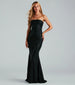 Make your entrance and exit memorable in the Makayla formal dress! She features a strapless neckline. a strappy lace-up back and ruched seam sure to turn heads. and a flattering mermaid silhouette that drapes effortlessly into a floor-length hem. The formal dress is crafted from a shimmery knit fabric with a stretchy lining. Complete the look with earrings and a statement ring for a black tie gala or anniversary party!