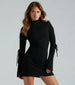 Make an appearance in this sweater mini dress for dates to dinners! The mini dress features fitted long sleeves with flared cuffs and eye-catching lace-up packets. a mock neckline. and a flattering bodycon silhouette. on rib knit sweater fabric. Complete the look with simple hoop earrings and heels.