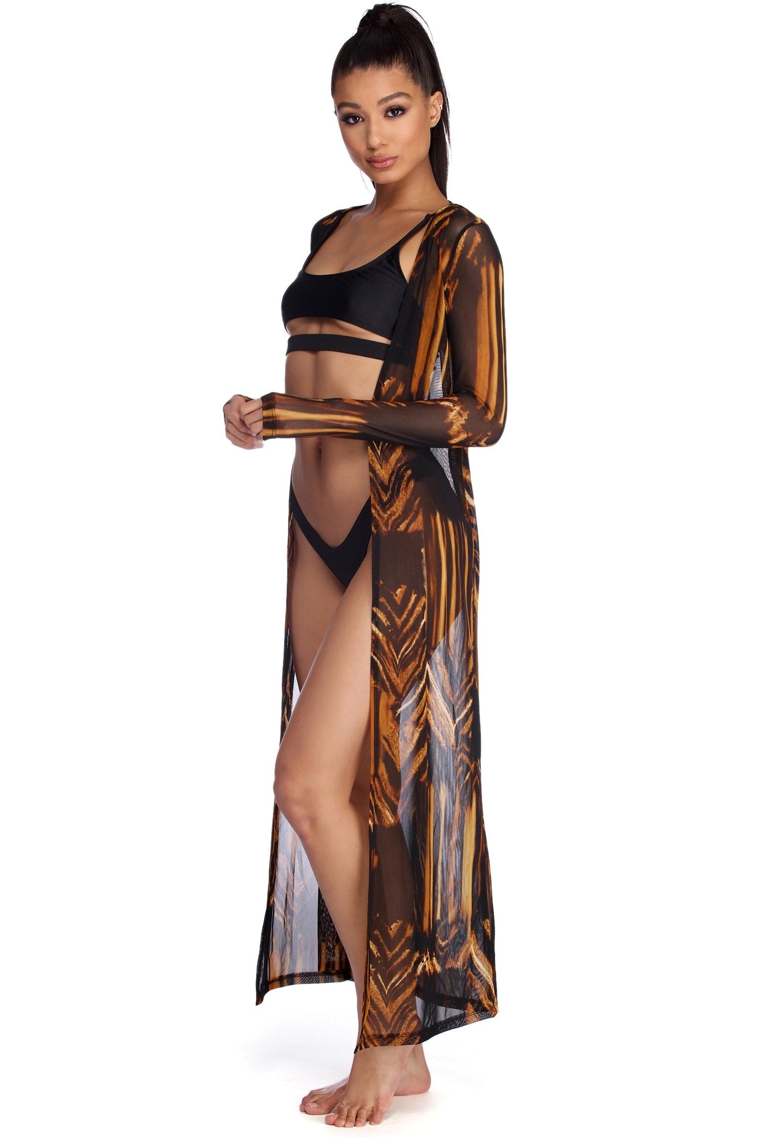 Make your 'fit wild and free with this animal print-inspired duster! It features long fitted sleeves. a drape open front. and a relaxed and comfortable fit. The duster is composed of a black and orange mesh fabric that offers plenty of stretch.
