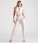 Make the shift into a breezy yet sophisticated style for the warmer season ahead! This linen-blend trouser pant features a high-rise waist. an extended tab with a button closure. belt loop accents. hidden side pockets. and a trendy wide-leg silhouette. Complete the look with the matching vest and pumps.