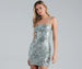 Create a magical moment with a mini dress that makes a glowing impression! The mini dress features a sleeveless square neckline. spaghetti straps. a damask sequin pattern throughout. a lace-up back design. and a short-length hem. The dress is composed of a lined mesh fabric that offers a form-hugging fit with minimal stretch. Complete look with rhinestone heels and a satin clutch.