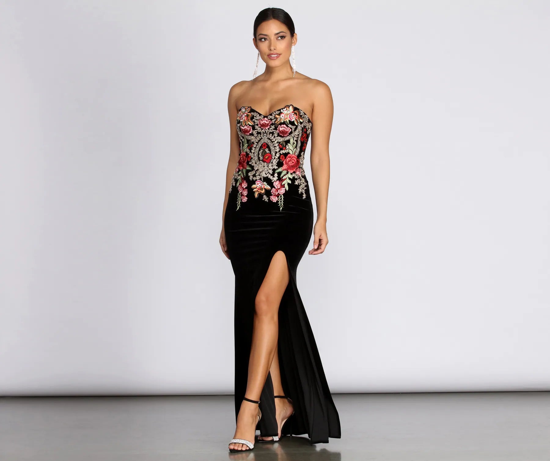 Keep it charming and lovely with enchanting roses! Our Marissa dress features a plunging sweetheart neckline. padded cups. boning at the sides for structure and a gel no slip-slip strip. Her bodice features an embroidered rose design with a metallic trim and sparkling heat stones. Her velvet skirt features a slim fit with a bold high slit to bring the drama! Marissa is composed of a mesh bodice and velvet fabric that offers a form hugging fit with a moderate stretch. Dress is fully lined and includes a back zipper closure with hook and eye clasp.