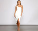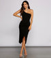 Have a major chic moment in our simply stunning Marissa midi dress! She features a one-shoulder neckline. a back zipper and hook and eye closure. a high waist. and a wrap front with a mid-length asymmetrical hem and a curve-hugging fit. Pair this dress with rhinestone statement earrings and a rhinestone cuff bracelet.