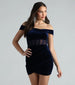 On the short Marla party dress. velvet is the star of the show! Showcase timeless glamour in her off-the-shoulder neckline. corset mesh-illusion bodice with flexible boning inserts. and a sultry. faux wrap hem that gives you the appearance of an hourglass figure. The formal dress is composed of a lined velvet knit fabric with a moderate stretch. Complete your dressy look with a gorgeous rhinestone clutch.