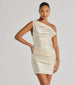 Sleek silky satin knit fabric gives the Marleigh mini dress its chic allure. perfect for your next formal party. It features an asymmetric off-shoulder neckline. pleated detailing at the bodice and waist. and a short bodycon silhouette to showcase your stunning curves.