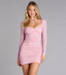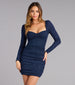Shimmer from every angle—the Mary glitter knit mini dress hugs your curves with a ruched bodycon fit. sweetheart neckline. and a bold open back detail. Long sleeves balance the shine. making it a chic choice for nights that demand a little extra sparkle.