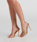 Show off major shine with these fab metallic stiletto heels! They feature an open toe with an asymmetrical strappy design. thin straps that lace up around the ankle. a sleek stiletto heel. and a textured chrome finish. Style with a bodycon dress and hoop earrings.