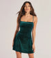 The velvet glitter dress features a sleeveless square neckline accented with pleating at the bust. sleek spaghetti straps. and a mini-length A-line hem. Complete cocktail outfit with a rhinestone clutch for extra pop of shine!Â