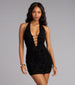 All eyes on you—exactly where they should be. This flocked mesh halter mini brings high drama with a plunging neckline. front strap cutouts. and a body-hugging fit that sculpts every curve. It's equal parts mysterious and magnetic—the perfect dress for your next night out with the girls!