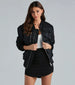 Accomplish your mission to achieve cool. streetwear style by layering on this camouflage bomber jacket! It features long sleeves. stretchy elasticized knit cuffs. and collar neckline. zipper front closure. five flap cargo-style pockets with velcro closure. one faux zipper pocket. hidden side pockets. and a relaxed silhouette with a stretchy elasticized back hem. The bomber jacket is designed with a camouflage printed nylon woven fabric with a quilted nylon woven lining and no stretch. Layer over a basic midi dress and sneakers for a movie and lunch!