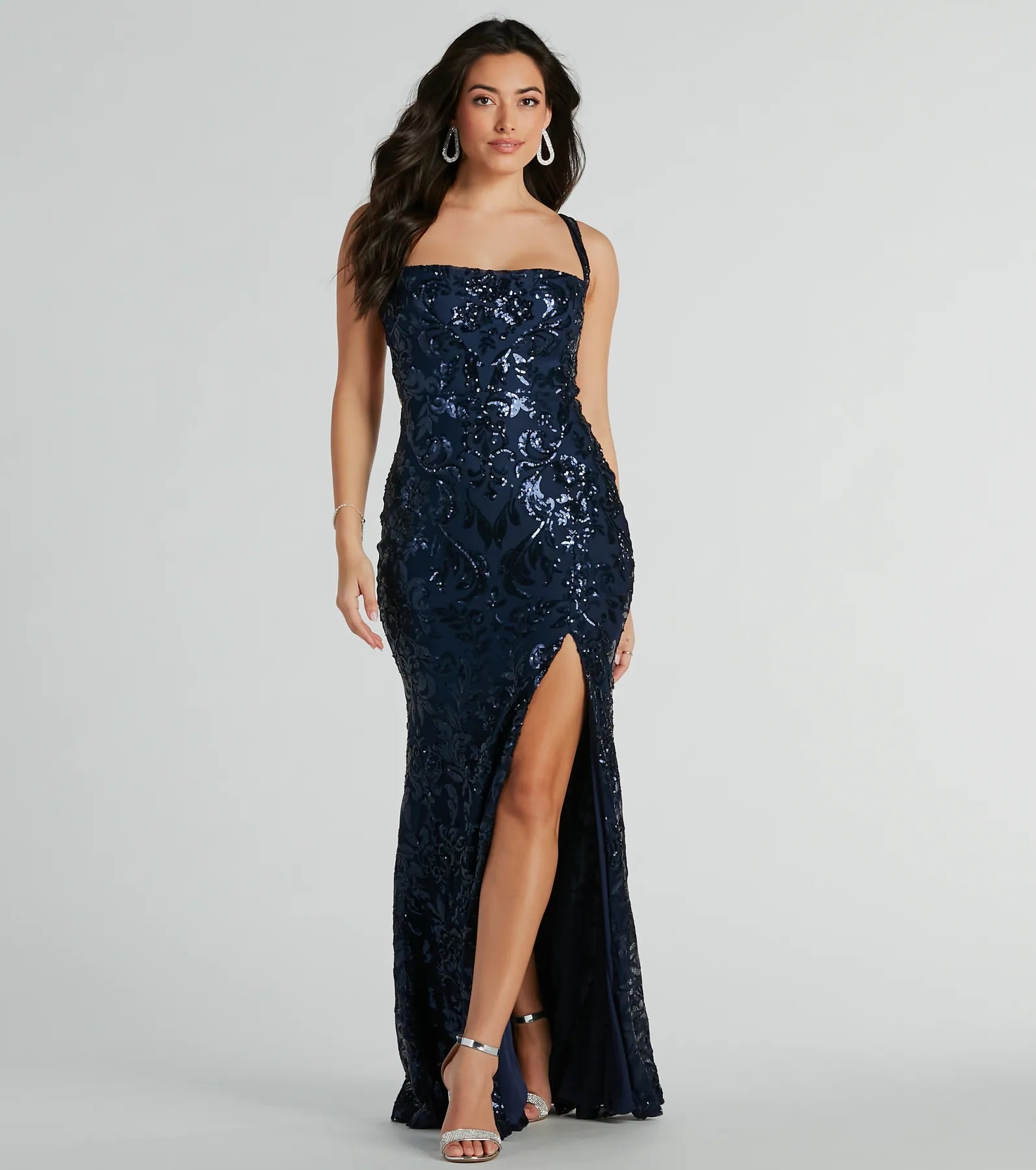 Shimmer like never before in the Moira sequin formal dress that brings glamorous sparkle to charity auctions. black-tie galas. and dances! Turn heads in the flattering sleeveless cowl neckline and a lace-up open back that lets you customize the style. The form-fitting silhouette accentuates your curves and features a high front slit that adds a sophisticated detail along the floor-length hem.